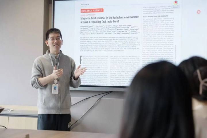 直到2022年3月,快速射电暴的奥秘被冯毅揭开小小一角。他首次提出统一解释重复快速射电暴偏振频率演化的机制,揭示了快速射电暴可能存在演化阶段。这一发现为最终确定快速射电暴起源确定了关键的证据。该项成果发表于Science杂志,同时和他深度参与的另外两项研究成果一道,入选了2022年度“中国科学十大进展”。